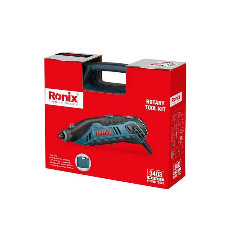 فرز برقی مینیاتوری 3403 به همراه متعلقات کاملی از ابزار و تجهیزات کاربردی برای سنباده زنی، برش، کنده کاری، صیقل دادن و ... بر روی سطوح چوبی ارائه می شود. این دستگاه مجهز به موتوری با توان 130 وات بوده که چرخشی بالغ بر 10000 تا 35000 دور در دقیقه فراهم می کند. این دستگاه از وزن سبک و کارایی بالا برخوردار است و با بهره مندی از سری ها و متعلقات گوناگون در ایجاد برش و شیار بر روی چوب کاربرد دارد. کولت 3.2 میلی متری فرز مینیاتوری 130 واتی رونیکس با سری ها و متعلقات مختلف مطابقت دارد. از دیگر ویژگی های این ابزار برقی می توان به سیستم قفل کن پین اشاره کرد که باعث تغییر آسان سری و متعلقات کاربردی و نیز افزایش ایمنی کاربر می شود